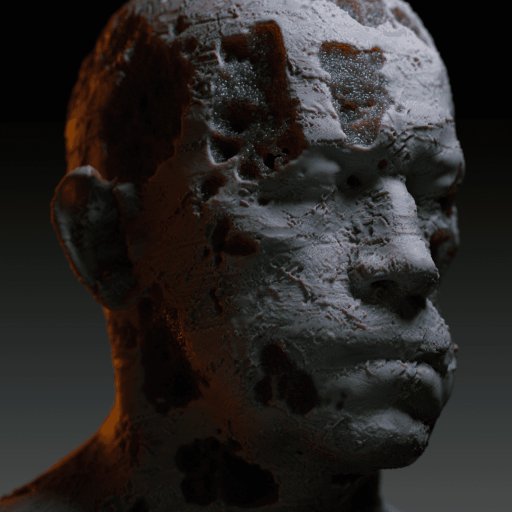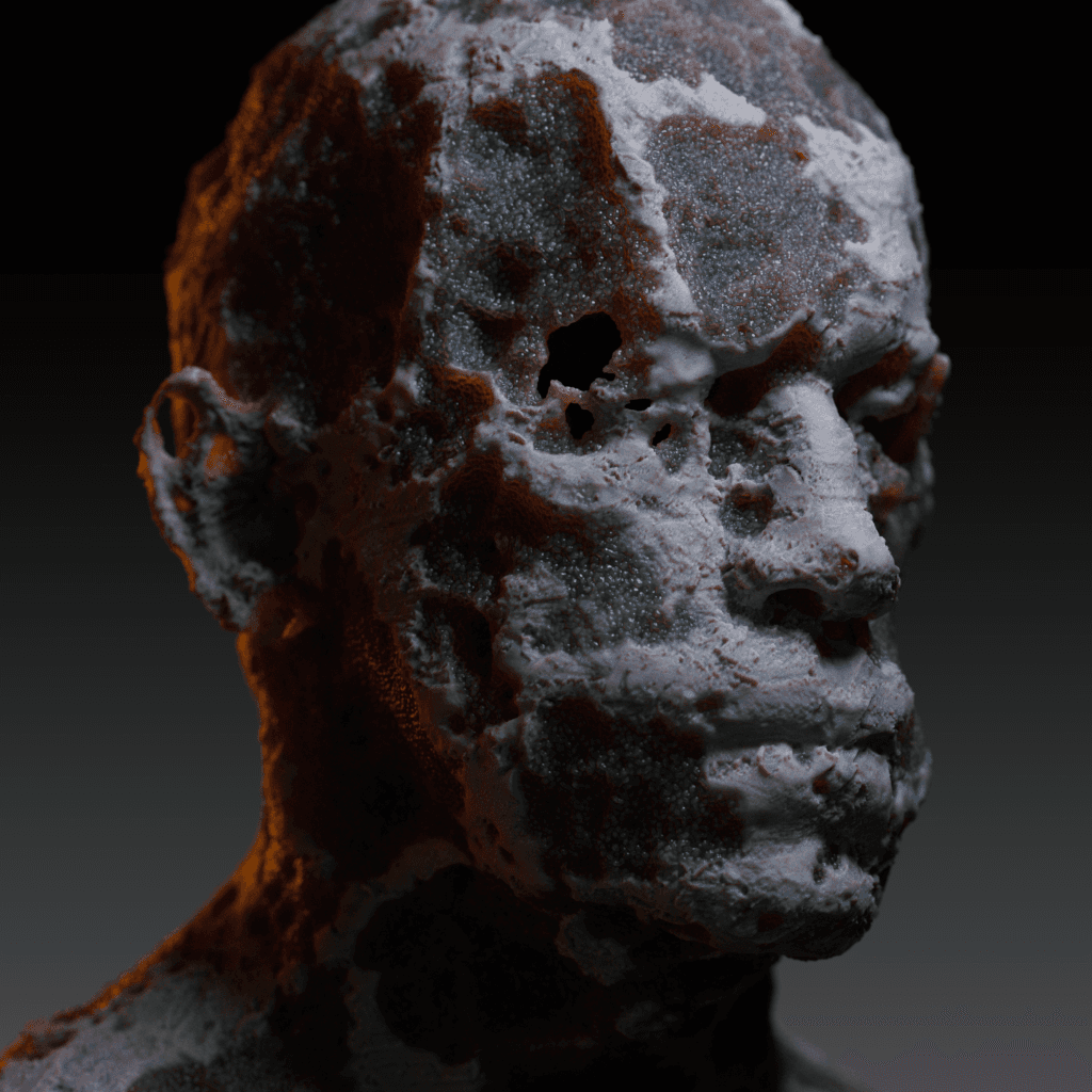 Personal project in which I wanted to explore VDB noise over a human face, revealing 2 different materials. Made in Houdini and rendered with Redshift.